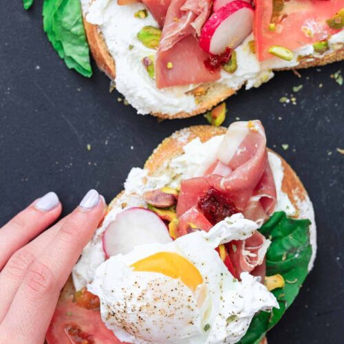 Spread the whipped ricotta cheese on the toasted Italian bread. Top with the remaining ingredients in the order listed (the poached eggs and a garnish of shelled pistachios are added at the very end). Enjoy!