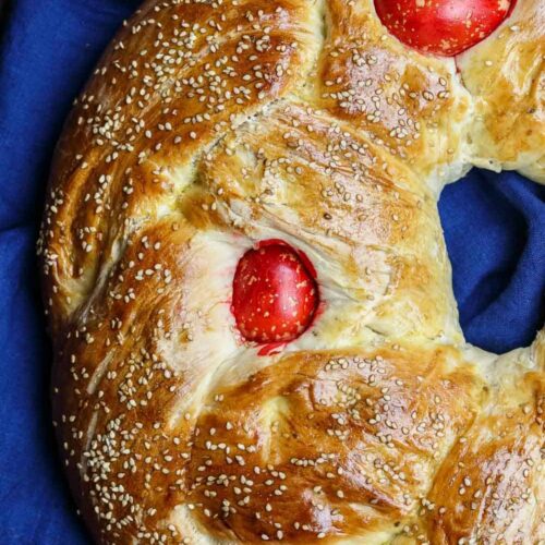Rub the dyed eggs with olive oil, and buff with paper towel. Select three spots in the dough, evenly spaced, and gently insert the eggs. Cover and return to warm space. Let rise 1 more hour until dough doubles in size.