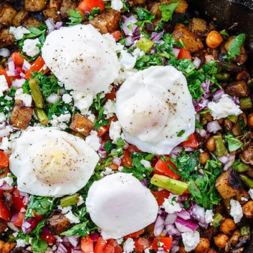 Mediterranean breakfast potato hash with Asparagus, chickpeas and poached eggs on top. A flavorful and nutrition-packed meal to kick-start your day.