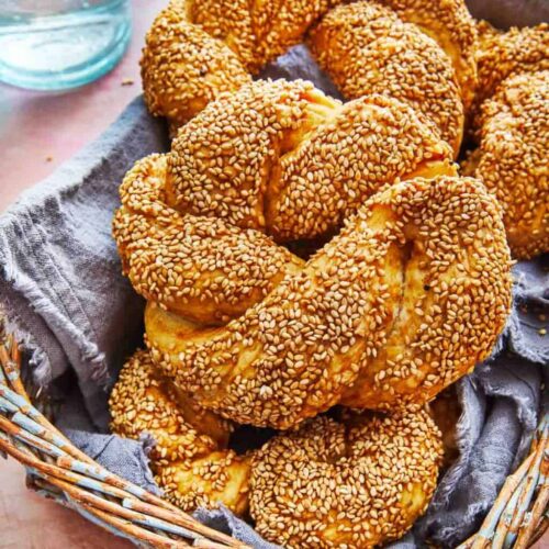Dip each ring: Dip each ring, first into the molasses mixture, submerging it completely. If you don’t have enough liquid to submerge it, flip it over so both sides are coated. Remove it from the molasses mixture, gently shaking off any excess. Set the bread ring in the sesame seeds, turn gently to coat both sides. Transfer to the prepared tray and set aside at room temperature for about 15 minutes, to puff slightly. Repeat with the remaining ropes.