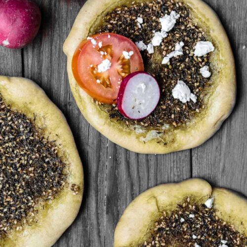 To serve as mezze simply portion the dough into smaller balls, form smaller discs about 3 inches in diameter instead. You should be able to make 12 or more manaqish. When you bake them, watch the oven closely as they will bake quicker.